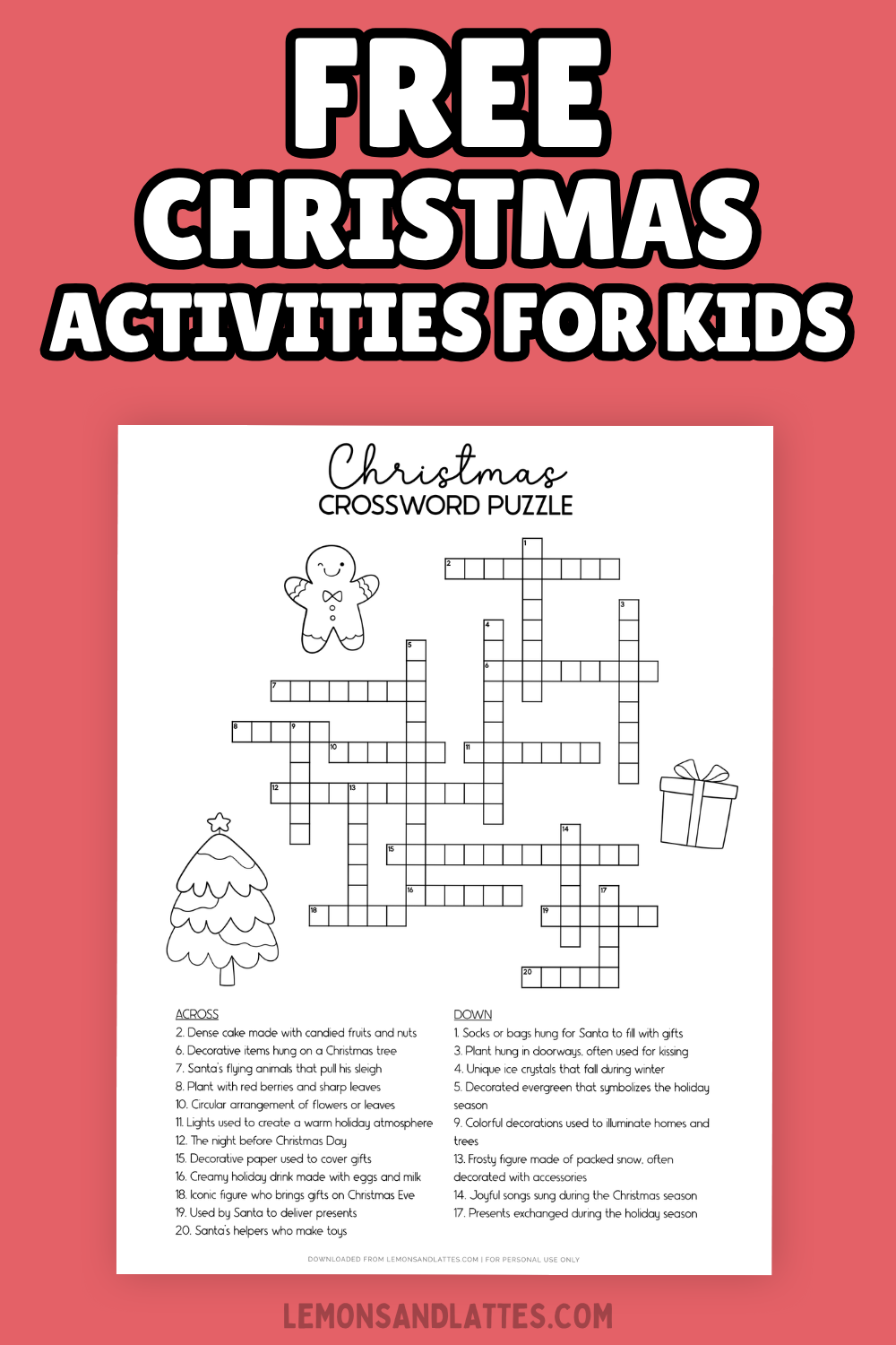This Christmas crossword puzzle is a fun way for kids to test what they know about the holidays. They’ll fill in each word using the clues, then color the little tree, gingerbread man, and gift when they’re done.