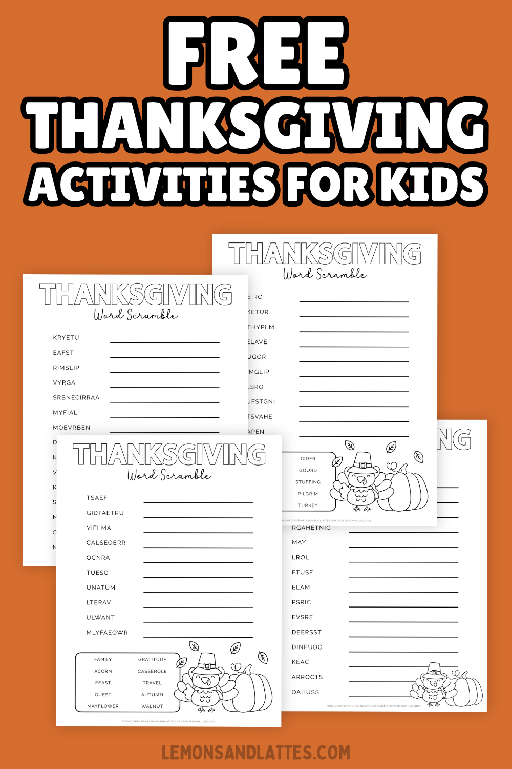 These Thanksgiving word scrambles are a fun challenge for kids who like word games. They can try to unscramble words like “pumpkin,” “harvest,” and “family,” then color in the small illustrations when they’re done. Answers are included!