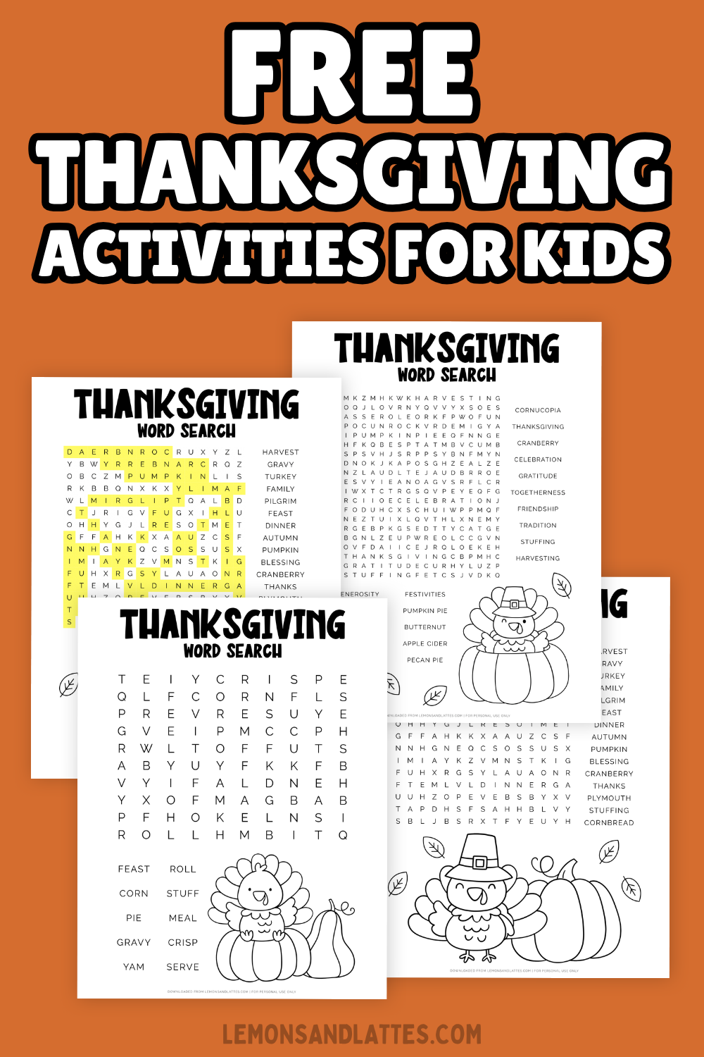 These Thanksgiving word searches come in three difficulty levels, so kids of all ages can join in. Each one includes themed words to find, like “pumpkin pie,” “family,” and “gratitude.”