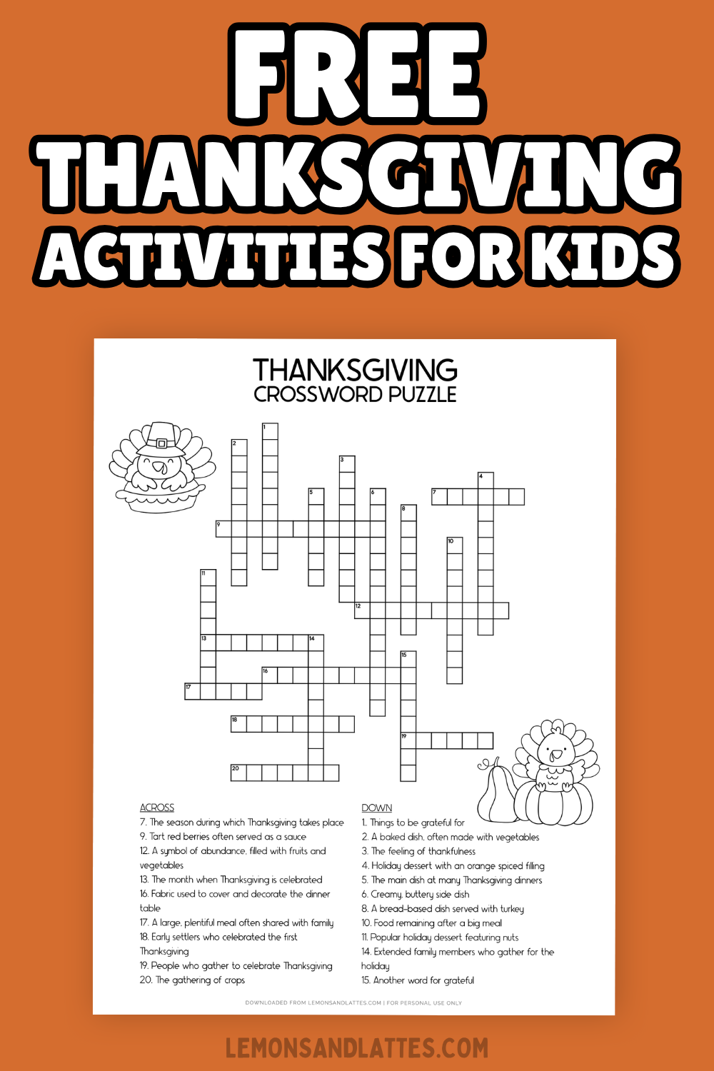 This Thanksgiving crossword puzzle is a fun way for kids to test what they know about the holiday. The clues cover Thanksgiving foods, traditions, and symbols, making it a fun challenge for older kids.